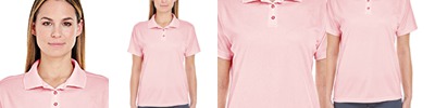 4 oz., 100% polyester mesh; Moisture-wicking; Pill-resistant; UPF 40+ protection; Feminine silhouette; Knit collar; 3-button placket; Hemmed sleeves;