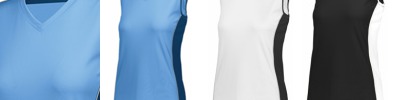 100% polyester wicking smooth knit with true hue technology™ that helps prevent dye migration; 100% polyester propelit micromesh wicking knit inserts; Wicking smooth knit with true hue technology™ that helps prevent dye migration; Wicks moisture; Odor resistant; Ladies' fit ; Pad print label ; V-neck collar ;