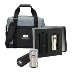 This special gift set features a 24 can capacity Cooler made of a rugged waterproof 500D Tarpaulin exterior. Leak-resistant heat-sealed liner. Includes a main zippered compartment, front zippered pocket, hook and loop secured handles and an adjustable/detachable padded shoulder strap and a stainless steel bottle opener. Measures 8" D x 14" W x 12.5" H.