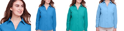 4.7 oz/yd2 / 158 gsm, 92% polyester, 8% spandex woven; Moisture-wicking performance; Spread collar with collar stand; Dyed-to-match pearlized buttons; Adjustable cuffs with button placket; Princess seams and back darts for flattering feminine fit; Side vents; Stretch performance; Active fit; Easy care;