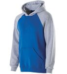 9 ounce 50% cotton/50% polyester smooth athletic fleece * Woven label * Self-lined hood with drawcord on Adult sizes only * Contrast color raglan sleeves and hood * Front pouch pocket * Rib-knit cuffs and bottom band
